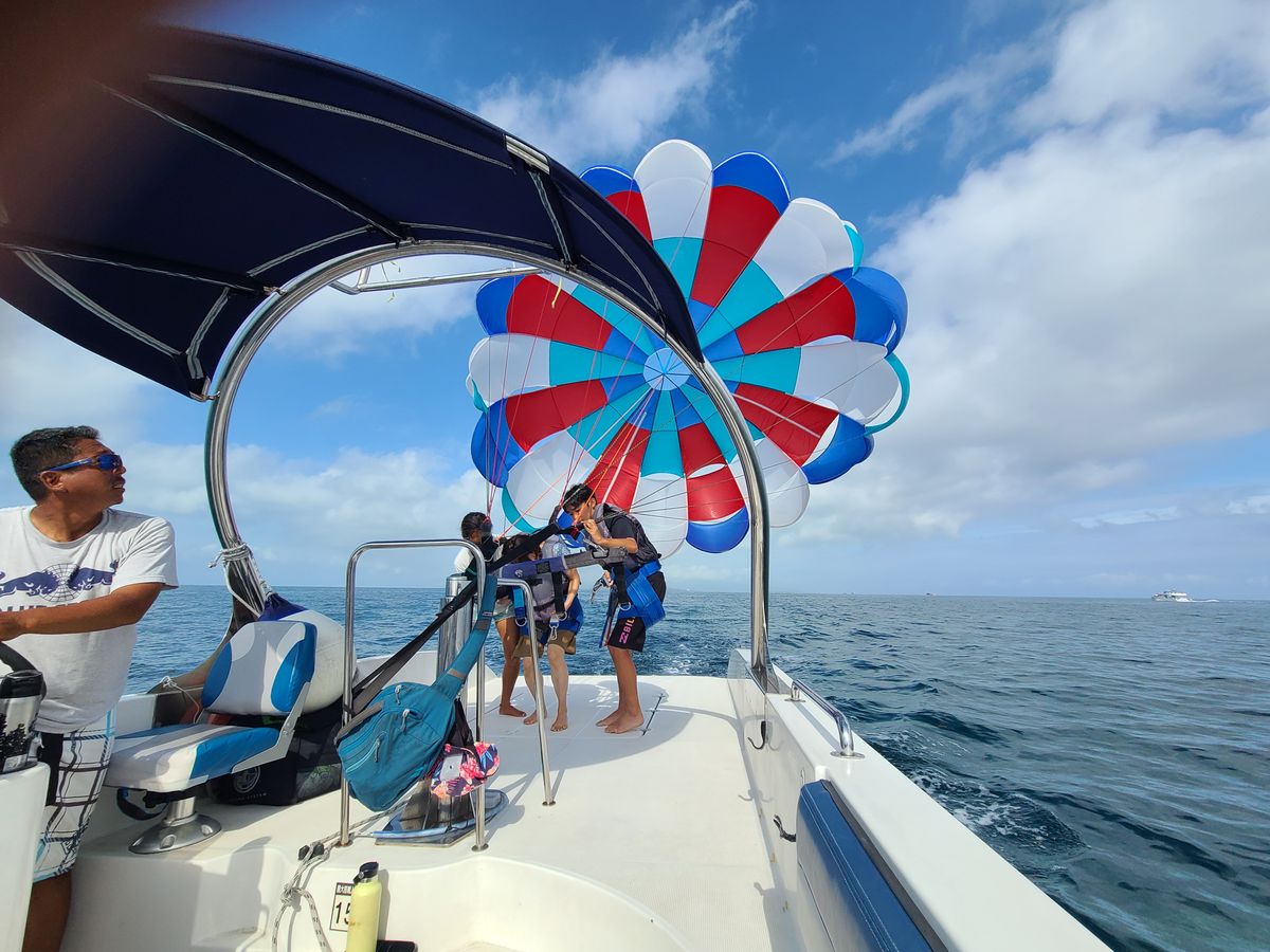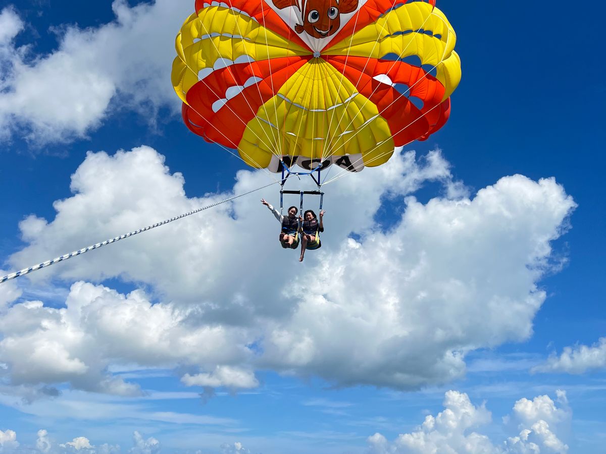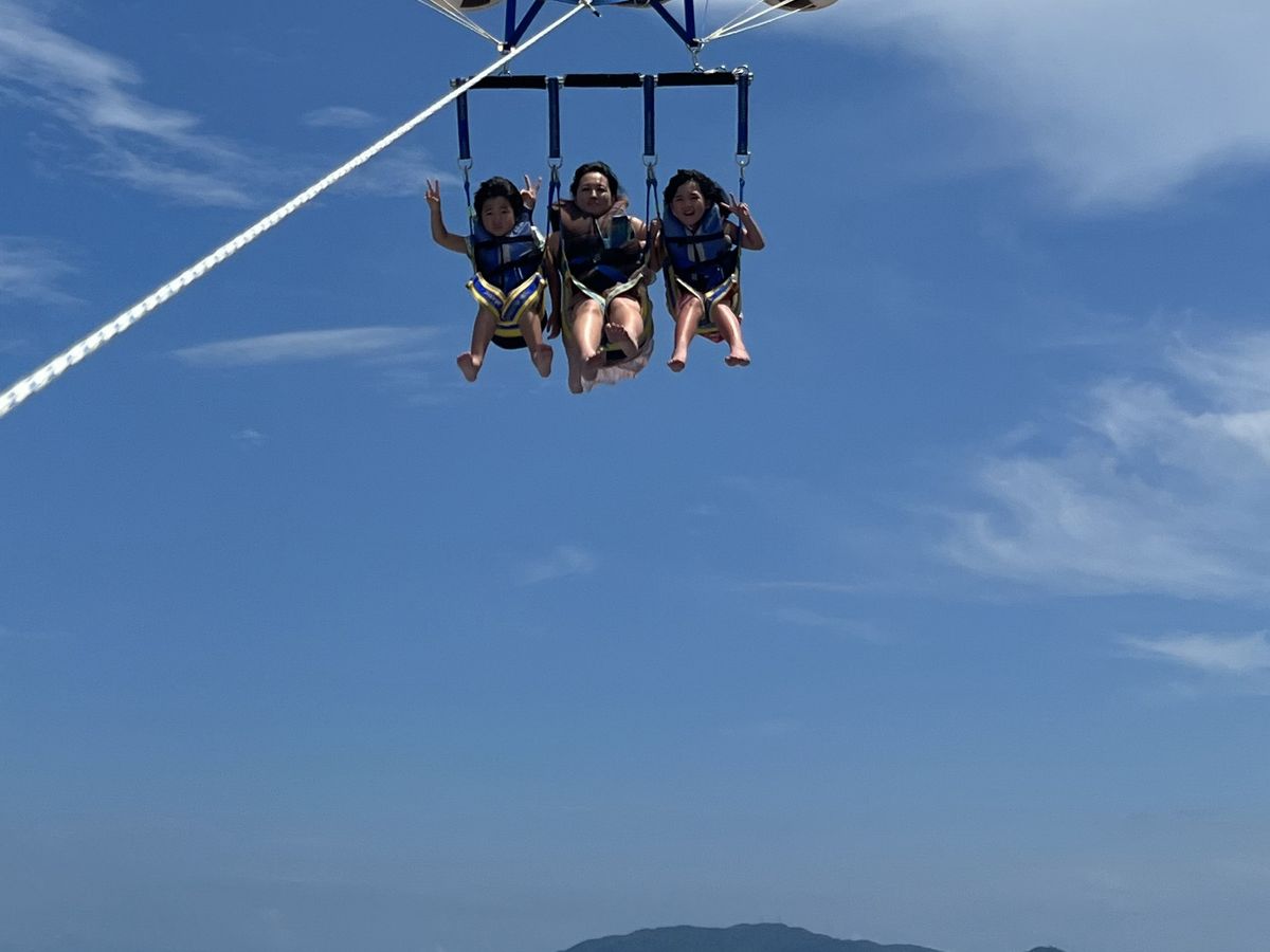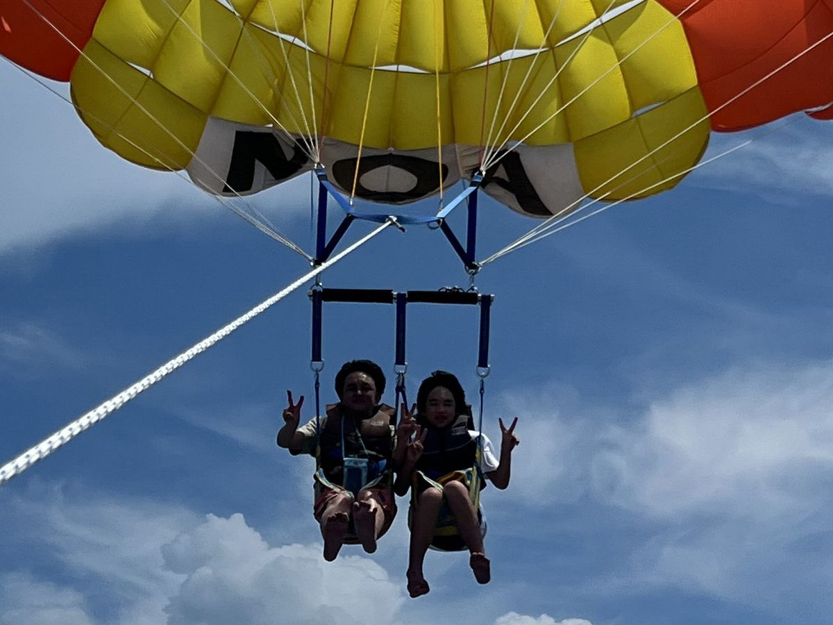 150メートルのパラセーリングをしました。飛ぶまではドキドキでしたが、緊張和らげるように話しかけてくださって楽しめました。空からの景色も最高で、思い出になりました!