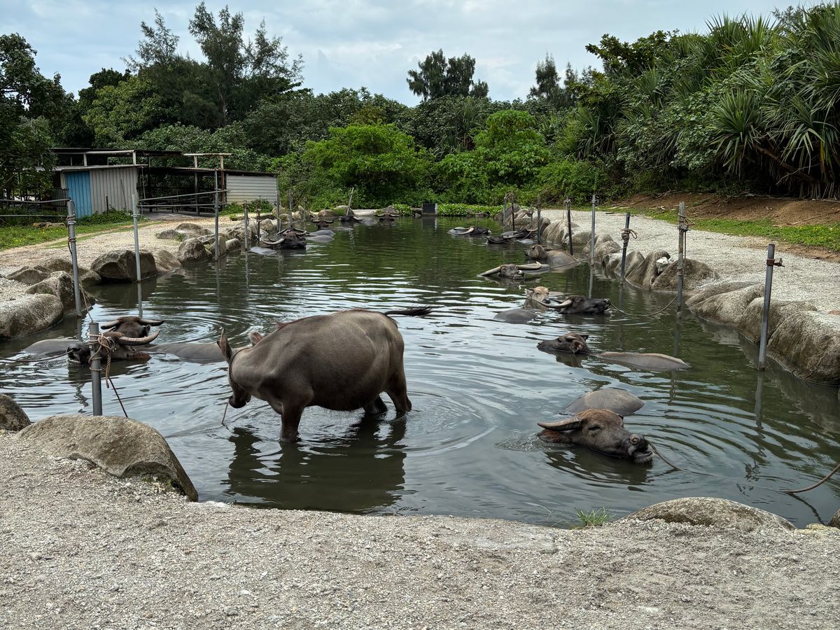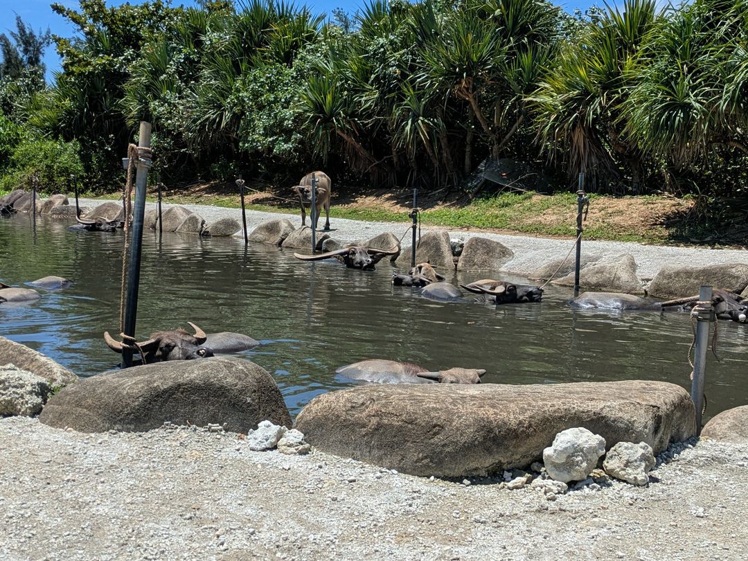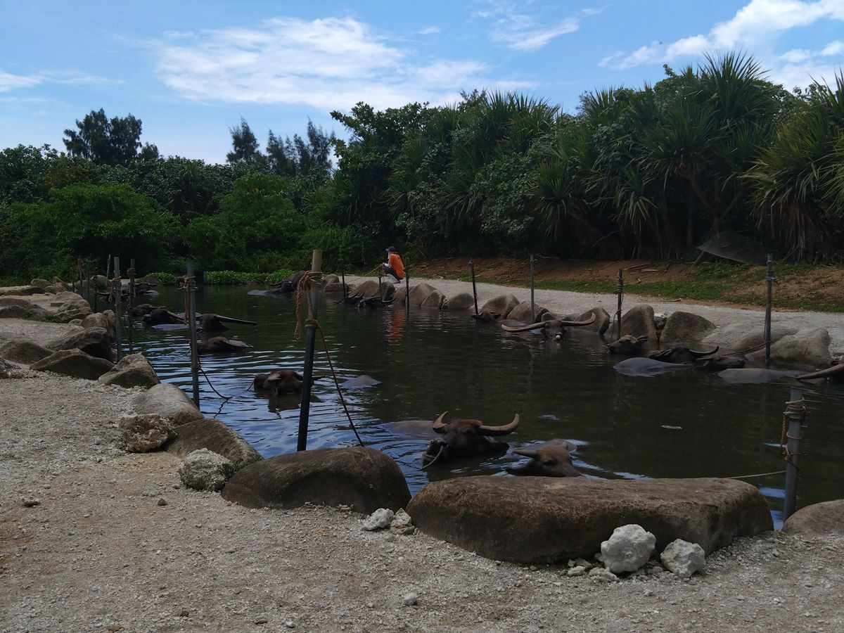 マングローブ遊覧が終わると油布島近くの水牛車乗り場まで観光バスで向かいますが、バスの運転手さんの話がこれまた面白いです。油布島までの道中は、水牛車のお兄さんによって雑学を披露してくれたり、三線を弾いてくれたり様々です。水牛たちは潮が満ちていても何のそのでじゃぶじゃぶ歩いてくれます。島で休んでいる水牛たちもとてもキュートでした。散策時間が結構あるようですぐに過ぎてしまうので(水牛と写真を撮ったりお土産をみたりで)、次回来るときは立ち寄るポイントをあらかじめ決めておいて効率よくまわろうと思います。