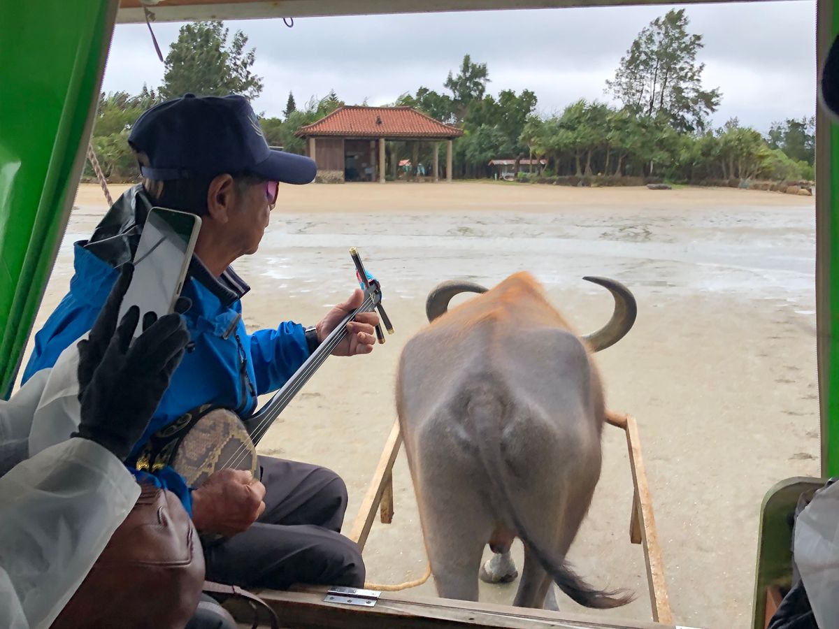 水牛車でゆっくり回るだけかと思っていたら、竹富島のお話をしつつ、三線の演奏もしてくださいました。