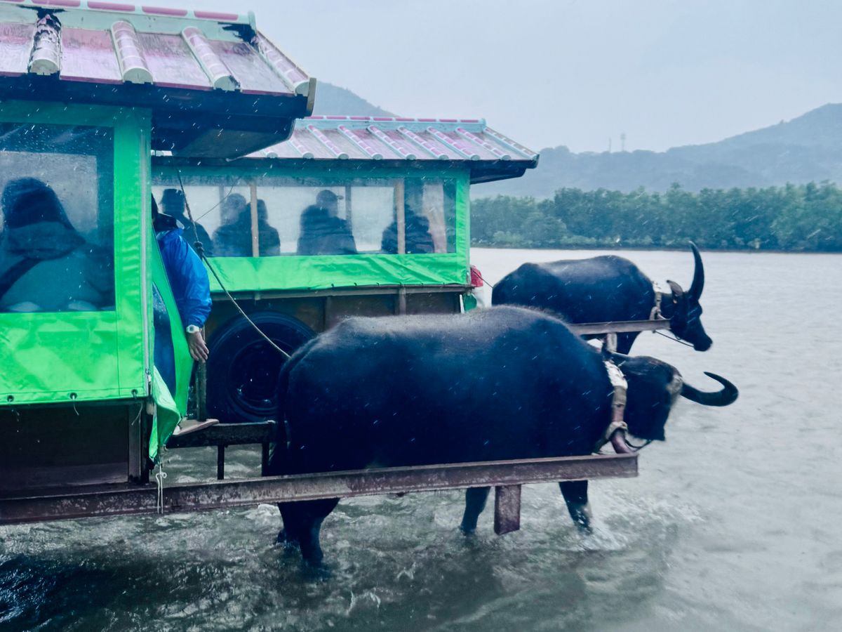 時間がなくて諦めかけていたが、半日コースでも島の雰囲気を味わうことができてとても良かったです。雨がパラパラと降ったり止んだりでしたが、綺麗な景色は雨でも綺麗でした。バスで水牛車乗り場までの移動中、運転手さんがバスをゆっくり移動しながら気さくに観光案内をしてくださいました。牛さんは夕方、最後のお客さんだと理解しているようで、早足で由布島へ渡ります。とてもかわいい子たちでした。