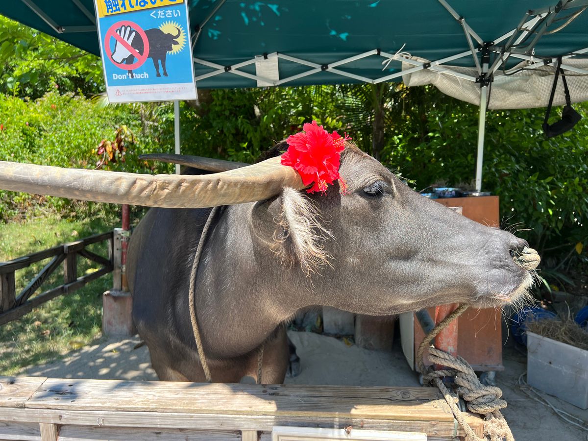 初水牛。やっぱり間近で見る牛さんは大きくてツノも立派!私たちを担当してくれたトミーは、竹富島からつけた名前で、ツノがハート♥️型のベテラン牛さんでした。竹富出身ではないらしいですが、のんびり、のーんびり三味線と唄を聴きながら沖縄の民家が見えて良かったです。最後に撮影写真もあり、トミーは、疲れたのか目を閉じてうとうとしていましたが、そこも可愛かったです。