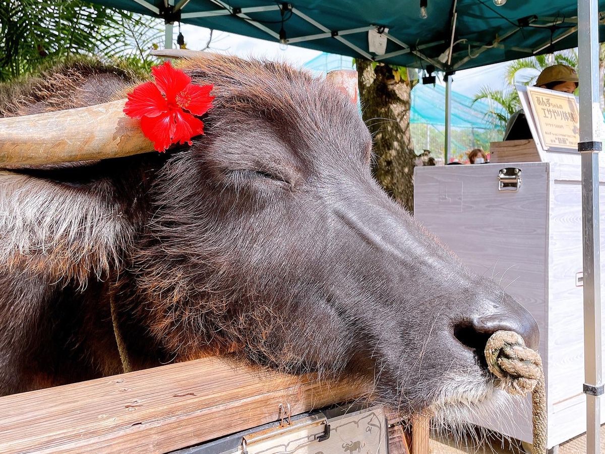 クルーズを終えると、バスに乗車し、水牛の出発地点まで行きました。バス移動の途中、運転手さんが一生懸命に運転しながら現地ガイドをしてくれました。その素朴さも、離島に来た感じがして良かったです。水牛車の出発地点では、7、8頭の水牛が待機しており、グループに分かれて乗り込みました。由布島までの移動中、現地の方が八重山の民謡を歌ってくれて、のんびり水牛に揺られて、ゆったりとした気分になれました。