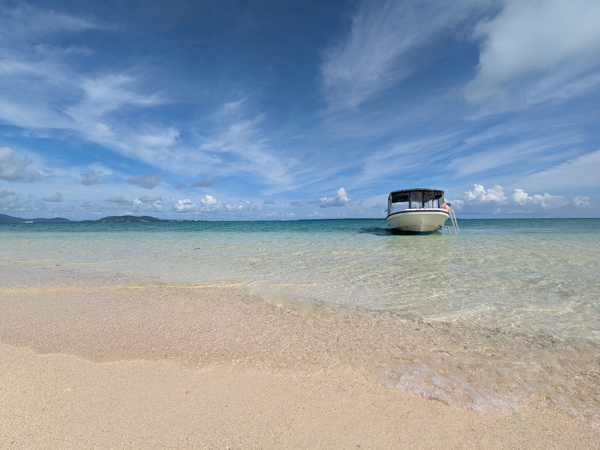 天気快晴、海の色はスカイブルー、波は凪、船上では心地よい風をきり、船長は元ホストで盛り上げ上手で最高の楽しい時間を過ごすことが出来ました。上陸してからも半分の時間でシュノーケル、残りの半分で写真撮影と希少な体験ができました。また、常にGoProで撮影していましたので、家に帰ってからも何度も見返す度に、当時の様相が鮮明に蘇ります。