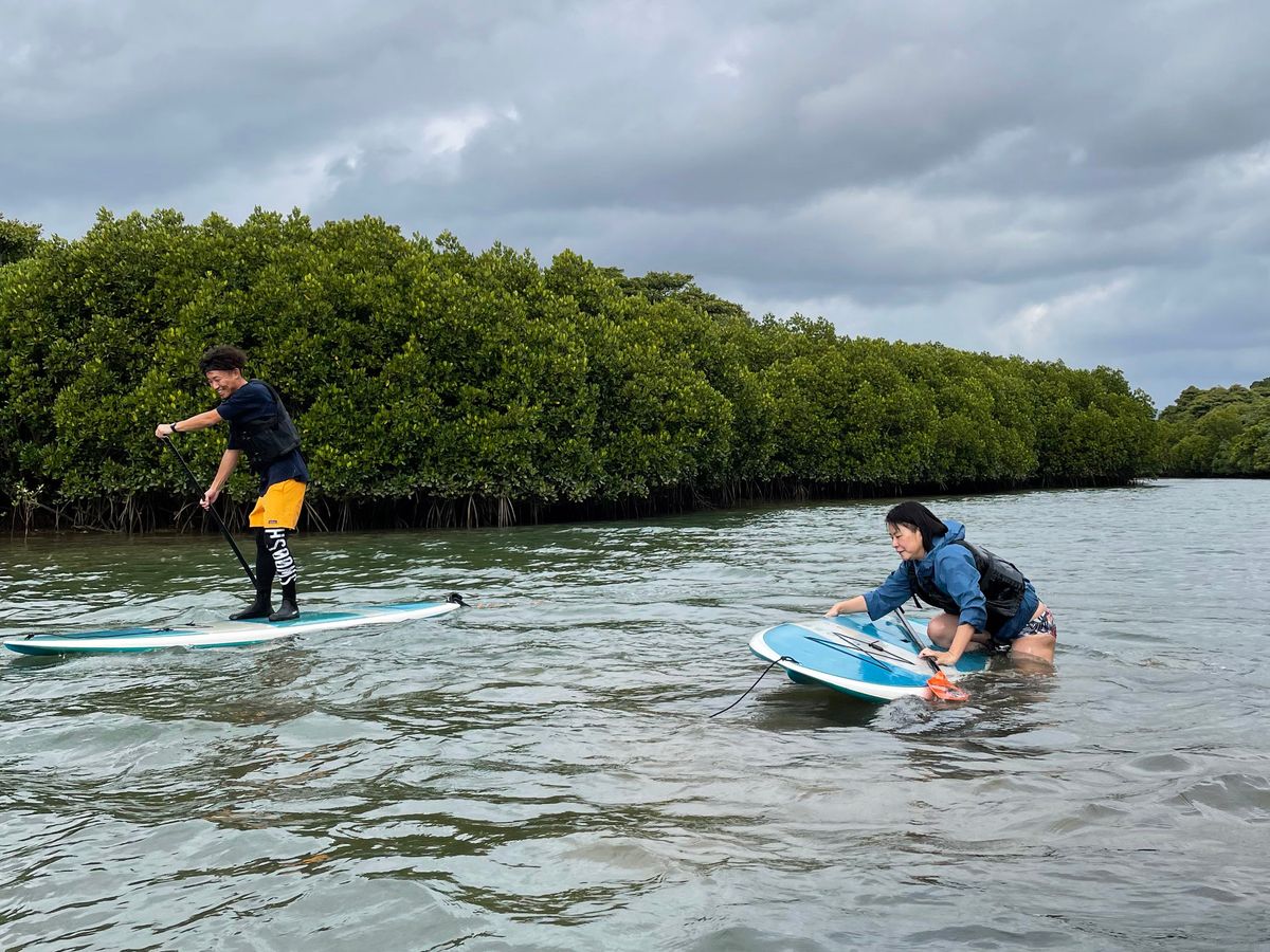 穏やかな川に到着すると、沖縄らしいマングローブの景色。簡単な講習を受けてから、いよいよ開始!私は慣れたカヌーで先に出て、妻がSUPに乗るのをカヌーの上からにやにや眺めていました。結論から言うと慣れるのは瞬殺。乗れずにバタバタするのを期待していただけに少し残念www