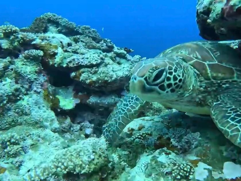 ガイドさんはウミガメ個体の性格も熟知しているようで、下の方にじっとしているウミガメを見つけて、人慣れしたウミガメなので待った方が良いとのことでしばらく待ち、上がってきたウミガメと併走して泳ぐ幸運に恵まれました。