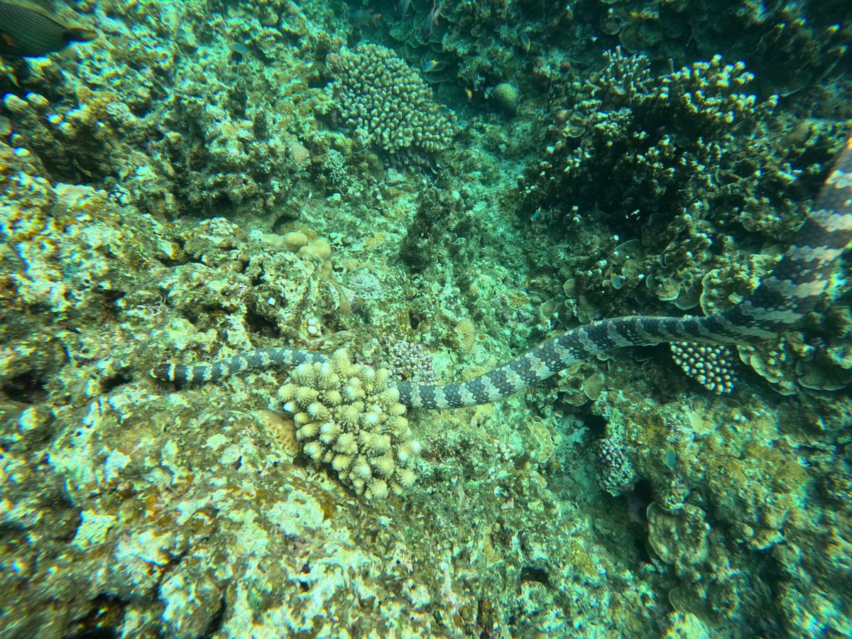 口呼吸を意識しながら、シュノーケル開始。開始そうそうすぐ近くをウミヘビが泳いで行ったので、びっくりしましたが、目の前をロクセンスズメダイが泳いで行ったり、大小色々な魚を見ることが出来ました。