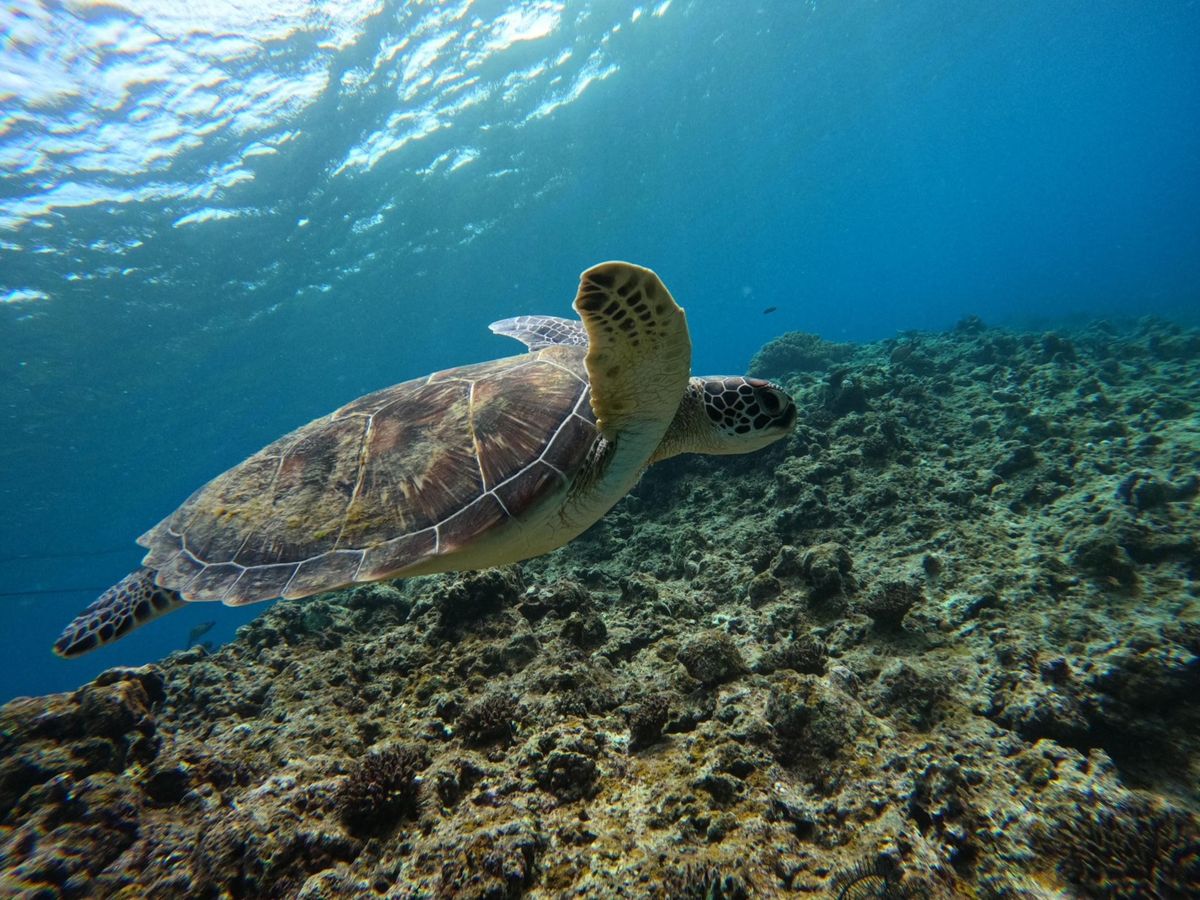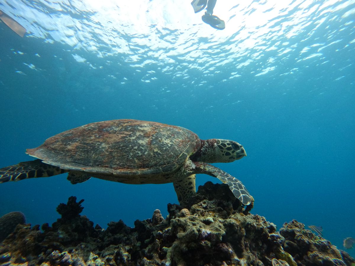 綺麗なサンゴ礁でウミガメと一緒に泳げました。