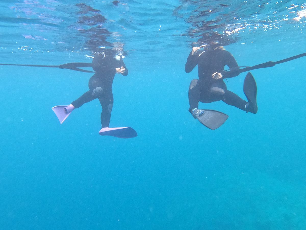まず、浅瀬でウォーミングアップ。透明度抜群で、曇り空でしたが海の中はどこまでも見える感じです。