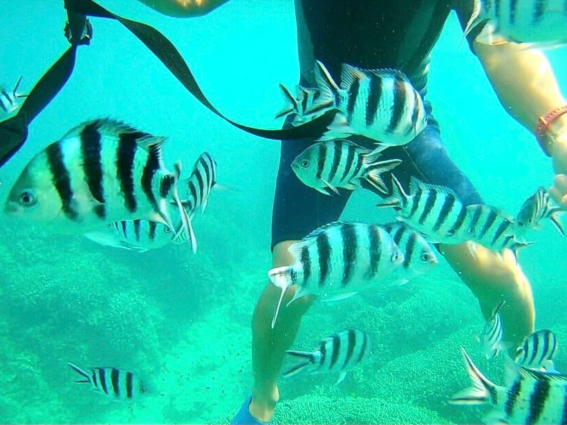 シュノーケリングは、海亀が見たかったので、ポイントに連れて行ってもらいました。沢山の魚達が寄ってくるように餌を撒いてくれたり、海蛇やフグやナマコを触らせてもらったり、ほんとお客さんを沢山楽しませてくれました。肝心の海亀はなかなかあわれなかったのですが、担当のgood sumさんが、すごく頑張って探してくれて、ラッキーにも海亀に会えました。触れそうな所まで行けて本当感動しました。