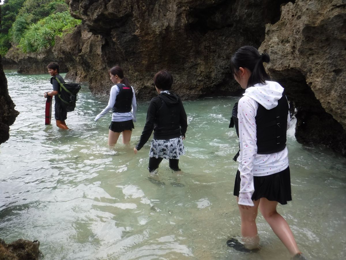 車を降りて青の洞窟へ向かう道は、サトウキビ畑を抜けて森へ入り、大きなヤドカリやヤシガニを踏まないように歩くのも沖縄ならでは。青の洞窟は台風後の参加だった為少し濁っていましたが可愛らしい青いお魚が泳いでいます。洞窟の散策もあります。引潮だったせいか掲載の画像よりも海水が少なくシュノーケルは海へ出てからになりましたが、ドロップオフのような場所を通過し餌を撒かずとも沢山の魚達を見ることができます。水族館で泳いでいるようなポイントには大満足でした。シュノーケルに夢中になっているうちに集団から離れてしまっても声をかけて頂けるのは安心ポイントでした。ツアー開始前にマスクやフィンの扱い方等の説明もあったので小さな子供や初心者でも問題無く楽しめると思います。また目の悪い子供でもレンズ付きのマスクを貸してくれます。シュノーケルではっきりお魚が見える!と娘はとても感動しておりました。ありがとうございました(^^)