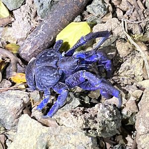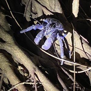 ジャングルの中を生き物を探しながら浜辺に出るのですが、浜辺に出るまでにヤシガニには会えずでした。スタッフの話では前日まで気温が高くお天気だったことが影響したとのことでした。雨が降った後の方がヤシガニの遭遇率が上がるそうです。満月に近い日だったので月明りで満点の星空とはなりませんでしたが、星空観賞ができたことにホッとしました。浜辺に出た後、再度、ヤシガニ探しに出かけ、参加者の中にいたお子様が、目線が低いこともありカエルやクモを見つけてくれました。ヤシガニには会えないままツアーが終わるのかなと思った帰り道にスタッフが崖の上に小さなヤシガニを見つけてくださいました。近寄って見ることはできませんでしたが、青さはわかりました。