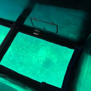船の中央にあるガラスを囲むように、乗客は左右の座席に座ります。座る位置によって自分の真下の水中は見えませんが、生き物が現れると全員が見られるように、船員が船の位置を細かく調整してくれていました。