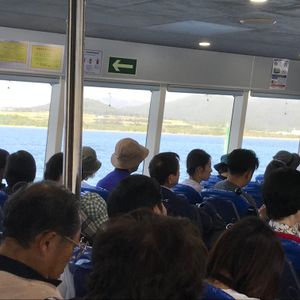 行きの船はあまり大きくなくて、自由席ですがほぼ満席だったので連れと離れたくない人は早めに行くべし。ゆっくり来たカップルは離れてかわいそうでした。天気は良かったのですが結構上下に揺れたので酔い止め飲んでおいて良かったです。