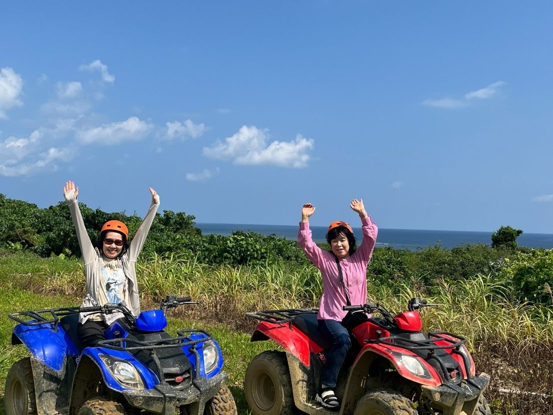 60代シニア熟女2 で参加致しました。初のバギー体験が不安もありましたが、担当のガイドさんの親切なレクチャーのお陰で思いのほか物凄くエンジョイできました。コースも凸凹ありアップダウンありのコース!気がつくとジャングルの中をスピードを出しながら風を切って走っている自分がいました。もっと長く乗っていたかったと思いました。老若男女の皆様に必須のアウトドア!と言っても過言ではありません。その後、水牛車に揺られながら海を渡るツアーも癒されるものでした。マイペースの水牛さん、ガイドさんの三線に合わせての歌も凄く良かったです。
