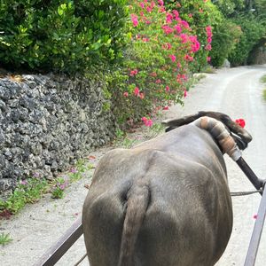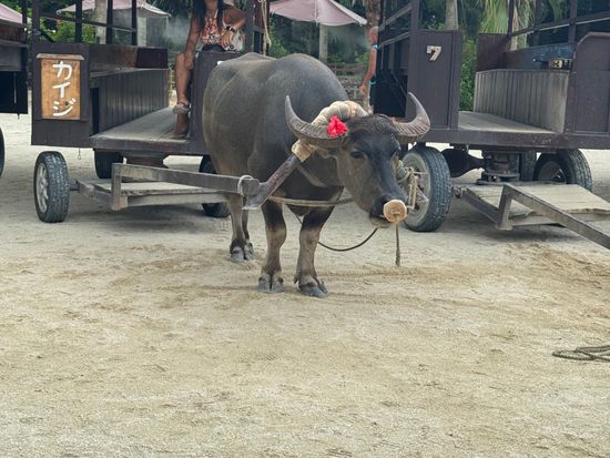 乗船チケット込み水牛体験を事前に予約しておいて良かったです。船を降りたら優先的にバスに乗れたので水牛体験までスムーズに過ごせました。水牛のオリオンくんは本当に賢く力持ちでまるでテスラの自動運転のようでした。三味線を聴きながら30分ほど乗りました。水牛との写真撮影もあります。その後はスコールで15分ほど身動きが出来ない時間もありましたが、近くの友利観光でレンタサイクルをして西桟橋、コンドイ浜へ行き自由時間を過ごしました。
