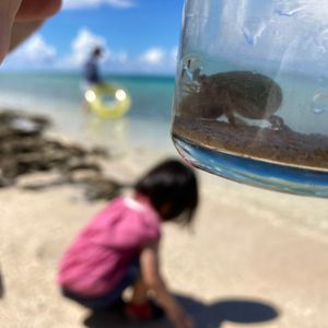 星の砂は3歳以下の子供をふたりつれた私にはちょっとむずかしく、見つけられなかったけど、その代わり、たくさんヤドカリが居て、大変盛り上がりました。