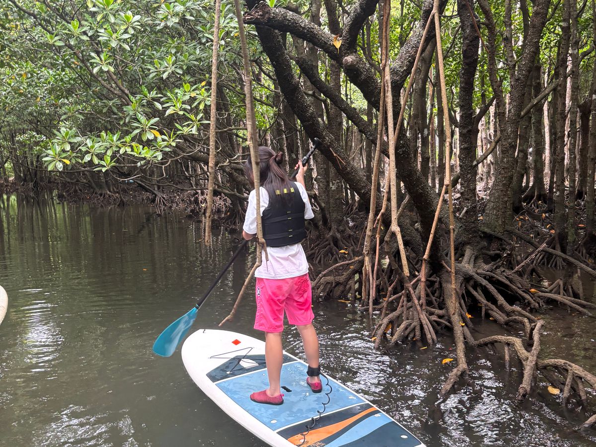 午前中のSUP体験ではとてもオモシロ陽気なガイドさんがついてくれて、妻も娘も他の参加者もずっと笑顔でした。マングローブやガジュマルの木に囲まれた大自然の中でのSUPは最高でした。