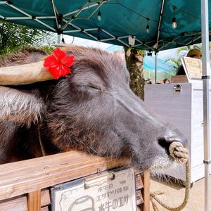 由布島は1年中南国の花々が咲き、また西表島と由布島の間をお客様を乗せてゆっくりと進む水牛さんはとても賢く、クリクリの目は愛嬌たっぷりです。