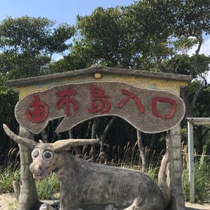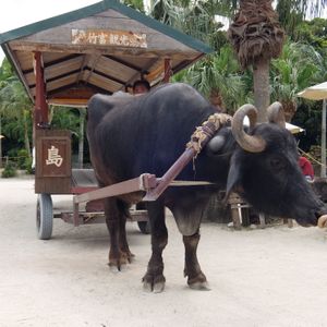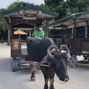 亜熱帯植物園 由布島では、のんびりとした時間が流れ水牛車に揺られながら浅瀬の海を渡る体験が人気でございます。
