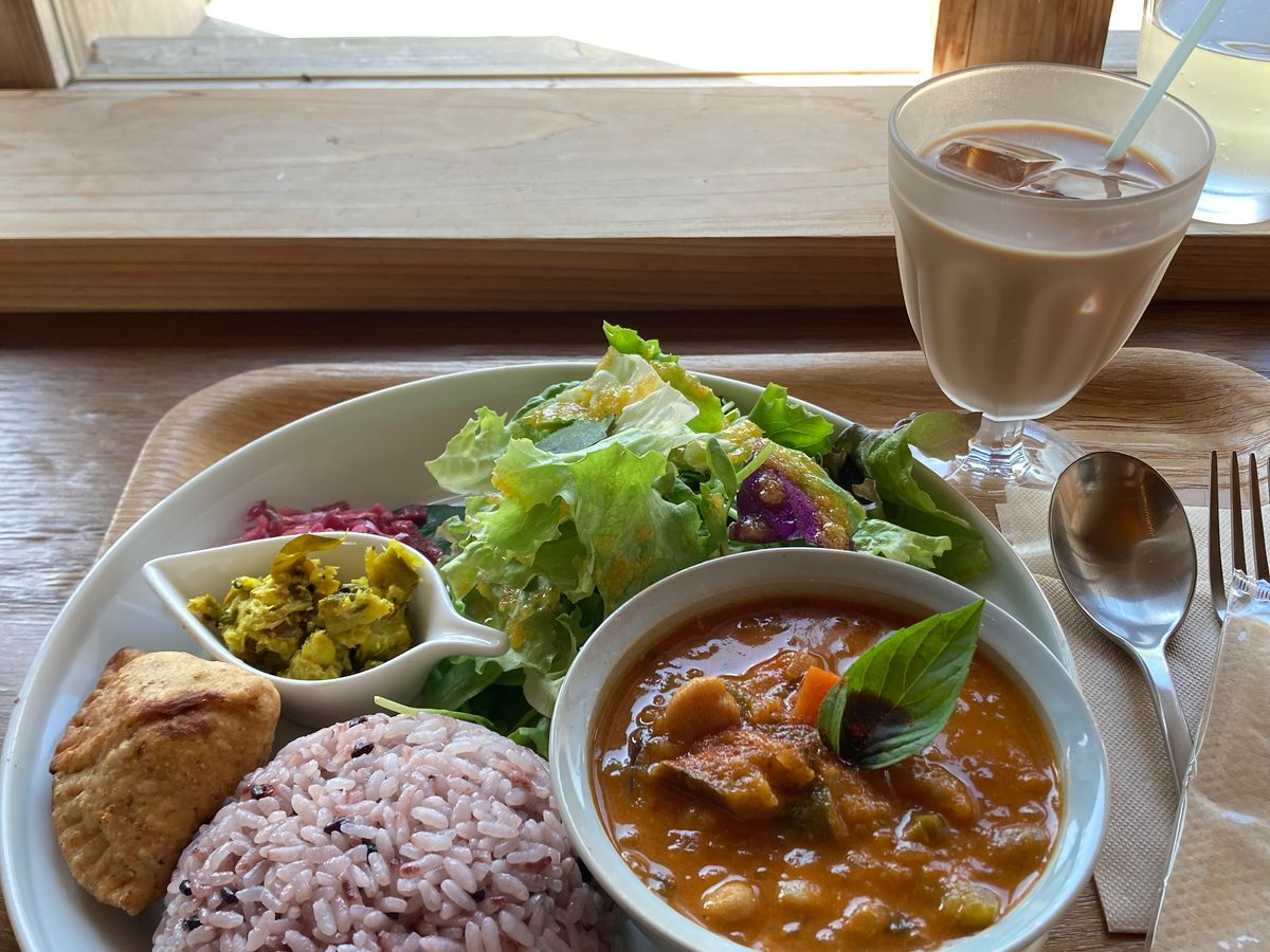 ぬちぐさカフェでのランチは、「ぬちぐさプレート」になります。追加料金を払えば他のスムージーなども味わうことができます。ワタシはセットドリンクと、サモサを追加しましたよ。