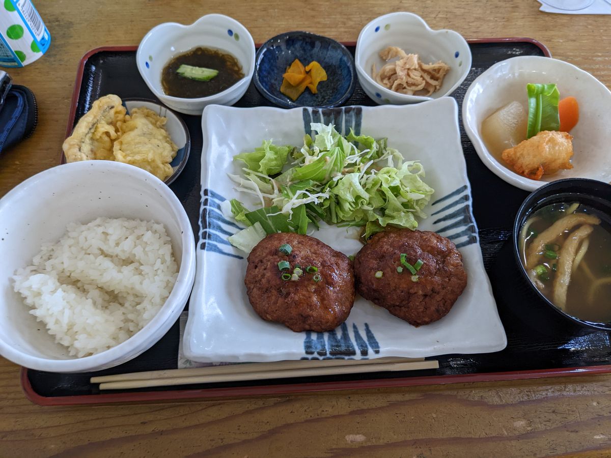 ランチは東バス系列のレストランで地元牛のハンバーグ。
