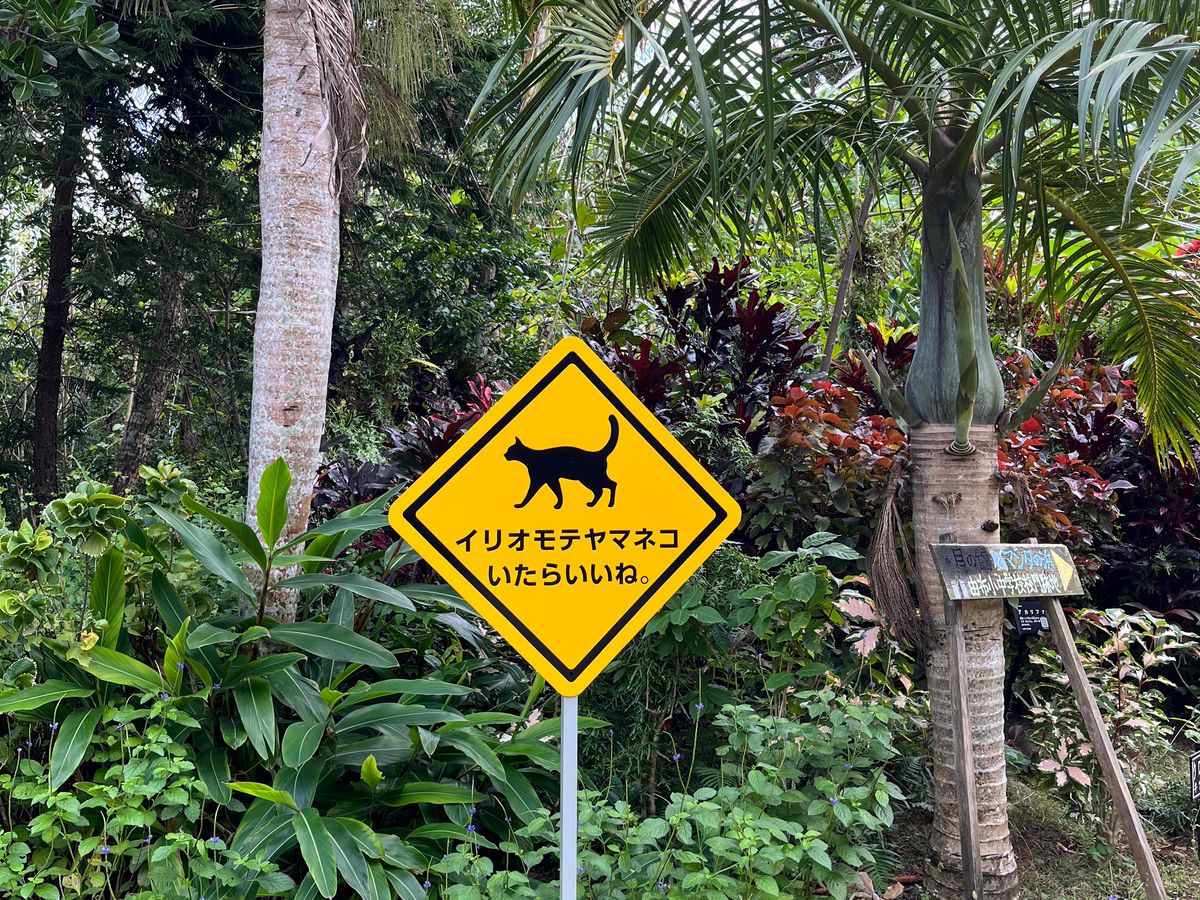 『イリオモテヤマネコ 飛び出し注意!』(←実際にあります!)の標識と思いきや、『イリオモテヤマネコ いたらいいね。』の看板。チャーミングなお写真の