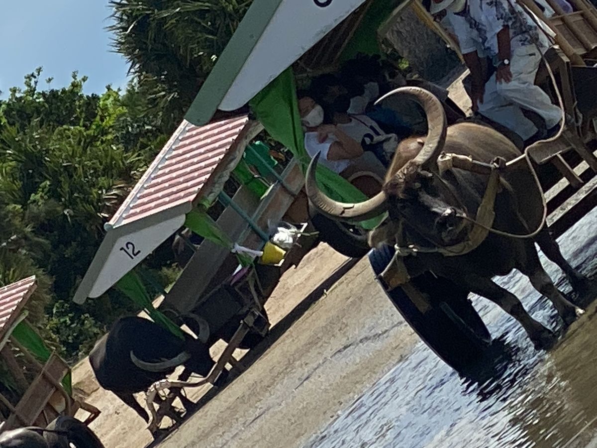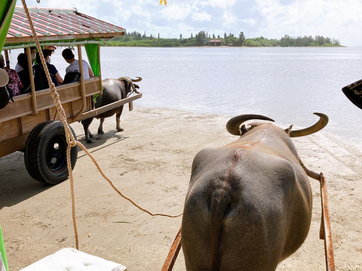 水牛に乗っての西表島、由布島移動は15分弱ですが、のどかで沖縄らしい雰囲気に浸かれました。