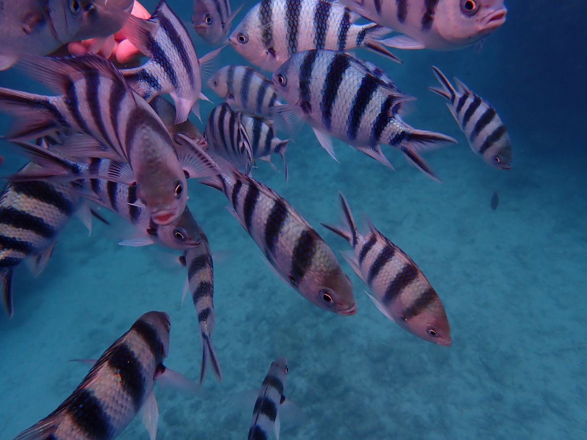 シュノーケリング中、多数寄ってきた魚は白黒の縞模様でイシダイの幼魚ににておりますが、ロクセンスズメダイとオヤビッチャになります。