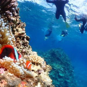 シュノーケリングツアーに参加すれば、ボートで沖まで出て、波の落ち着いた場所から泳ぐので安心です。