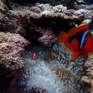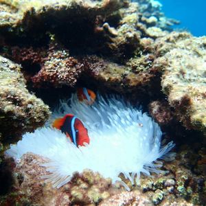 次に向かったポイントでは、ダイビングコースの方たちはダイビングをし、私たちシュノーケルコースの人たちはシュノーケルを楽しむことができました。シュノーケルコースは私たち2人だけでしたがガイドさんが、クマノミがいるスポットやサンゴがたくさん生えているスポットを写真も撮っていただきながら案内してくださいました。オニヒトデの被害を受けたサンゴの死骸もありましたが、サンゴの花畑のような場所で魚たちの生き生きとした姿をたくさん見ることができ、貴重な景色を見ることができて、とても満足です。