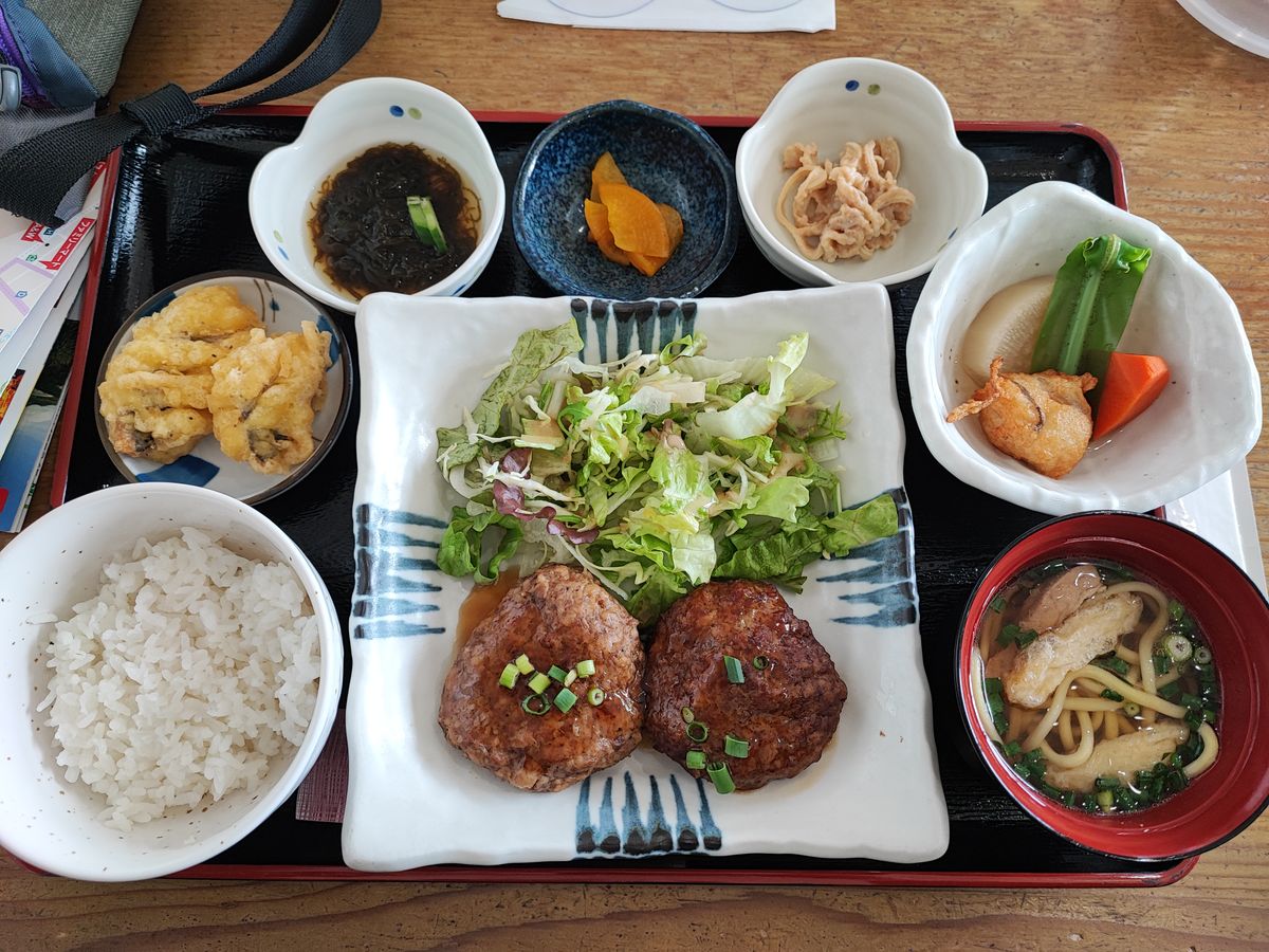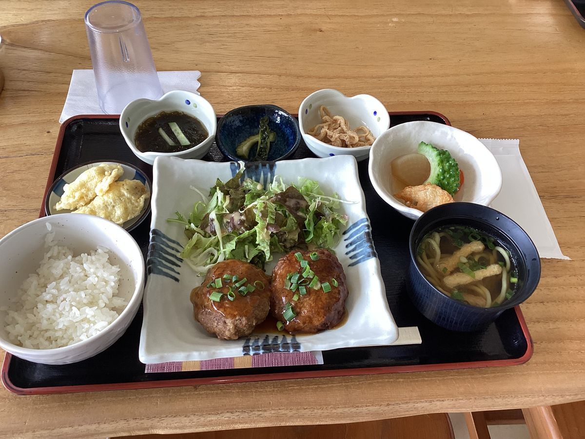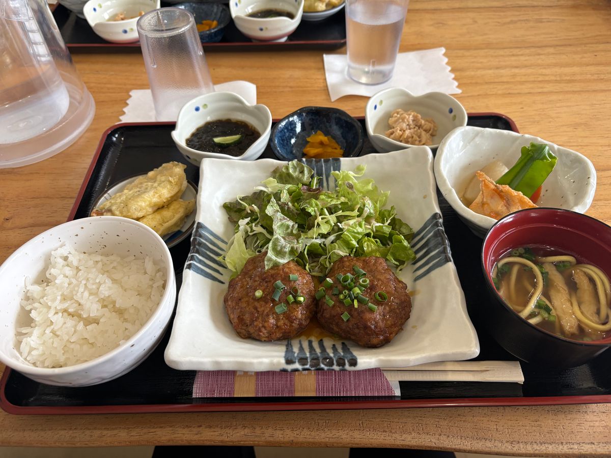 昼食はメインのハンバーグ?つくね?がねっとりしてて口に合いませんでしたが煮物はとても美味しかったです。白米の量が少なく物足りなかったです。