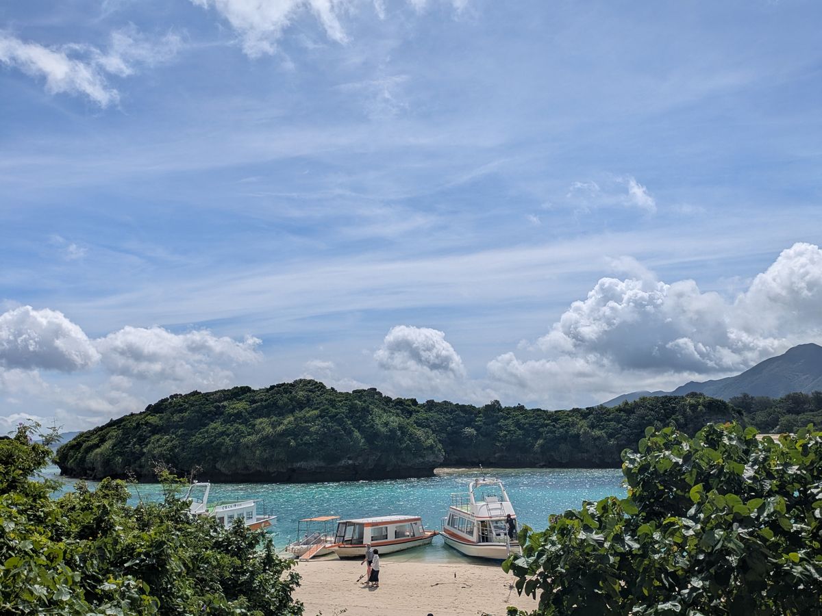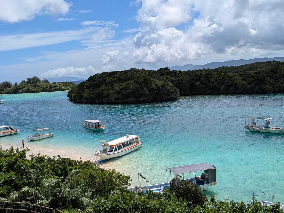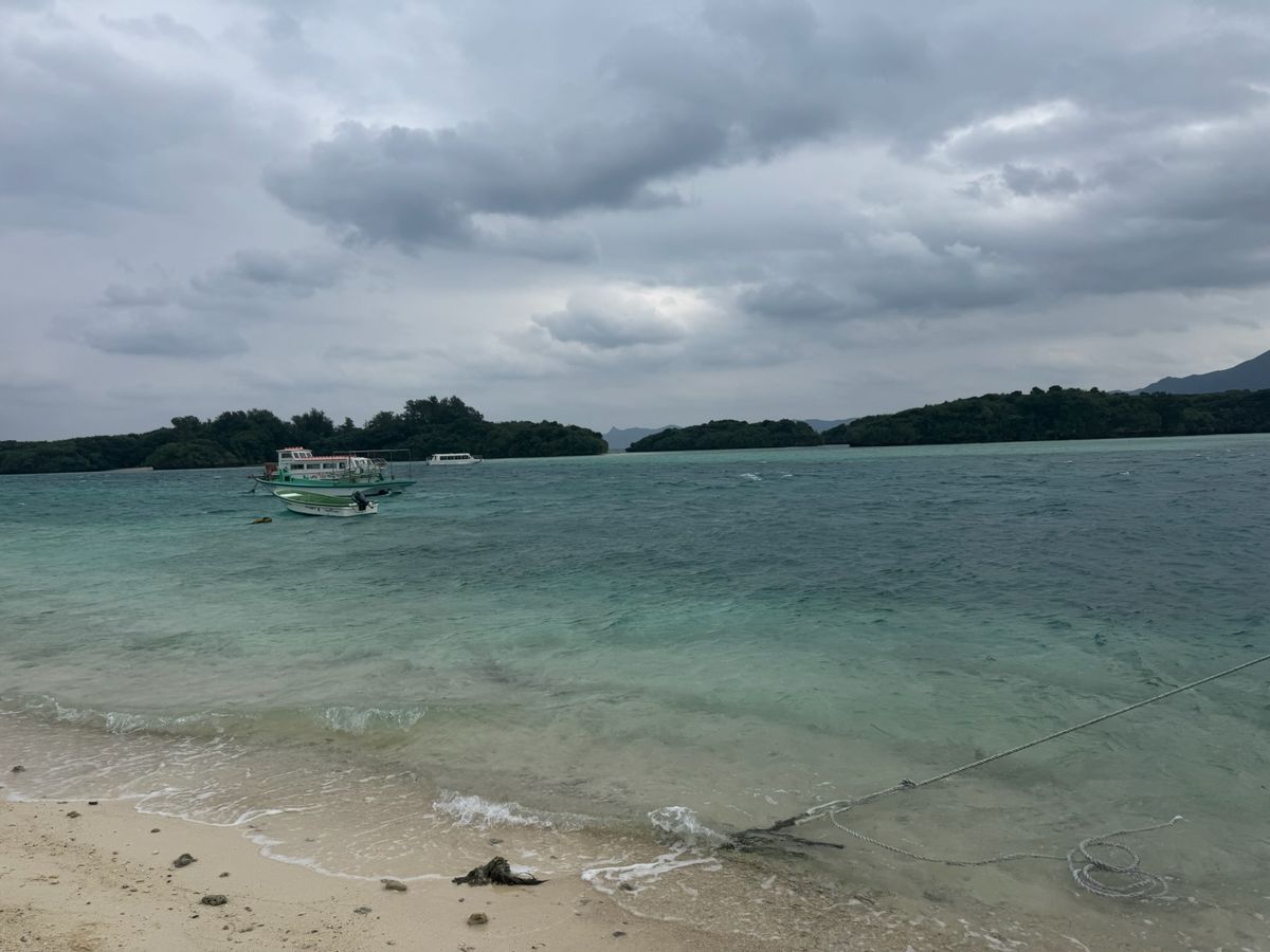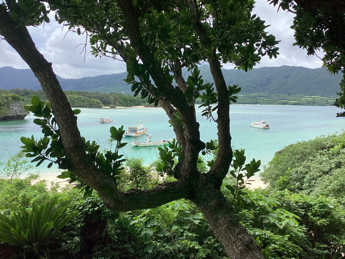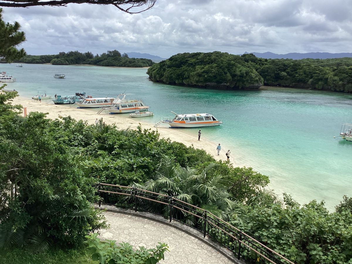 朝から雨と分かってたので、バスで観光地巡りで凌ごうと思いました。雨は止みそうに無いし、川平湾のグラスボートは中止となって「何だかなぁ〜」でもガイドさんのお話しも分かりやすくて退屈はしませんでした。そして川平湾に着くと人っ子一人居なくて湾の中にグラスボートだけ何隻か浮かんでる。スタッフも誰も居なくてとっても静か。幻想的でした。以前、晴れの日に来て賑やかな光景を観てたので逆に穏やかな川平湾に癒されました。この風景を見ながらゆっくりコーヒーを飲みたいなあーと思いました。雨の日の楽しみ方も有るんですね。