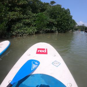 当初は川平湾でのSUPの予定でしたが、あいにくの悪天候だったためマングローブでのSUPに変更になりました。私たちの他にカップルがもう一組いて、計4人での参加となりました。SUPはやったことがなく、乗ることすら出来ないのではないかと思いましたが、主人の方は最初から立って乗ることが出来ました。私と、もう一人の女性は座りながら漕ぎました。中々最初は難しく、行きたい方向に行けなかったり上手くスピードが出せなかったりしましたが、スタッフの方の丁寧なご指導もあり、途中から勇気を出して立って乗ることも出来ました。