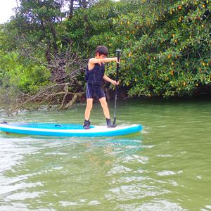 今回、息子の小学校卒業旅行として、家族全員で石垣島旅行に行ってきました!初めての石垣島ということで、何をしようかいろいろ調べましたが、SUPは体験したことがなかったので、ぜひやってみたいと思い、初日のメインイベントとして予約しました。特に、きれいな水で有名な川平湾でSUPができるこのツアーに魅力を感じ、楽しみにして行きました。当日、天気はまずまずだったのですが、残念ながら風が強く、安全面を重視し、場所の変更を余儀なくされました。変更先は宮良川でしたが、インストラクターの方が楽しく案内して下さり、気持ちはSUP体験に向いていきました。初めてのSUP体験でしたが、乗り方について分かりやすく教えて下さり、スムーズに乗ることができました!まずは座ってパドルをこぎ、少しずつ慣れていきました。マングローブの景色に癒されながら、家族皆で楽しめました!家族皆で、しかも沢山写真を撮っていただき、とても良い思い出になりました。最後、より楽しめるように場所を移し、立ってこいだり、少しですがヨガSUPも体験し、大変楽しいときを過ごすことができました!帰りには、沢山の写真データをいただき、大満足のツアーとなりました。ぜひ、また利用したいと思います。次回は川平湾で!