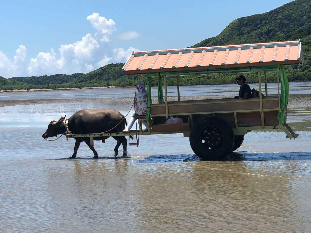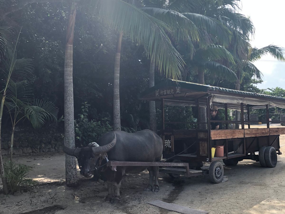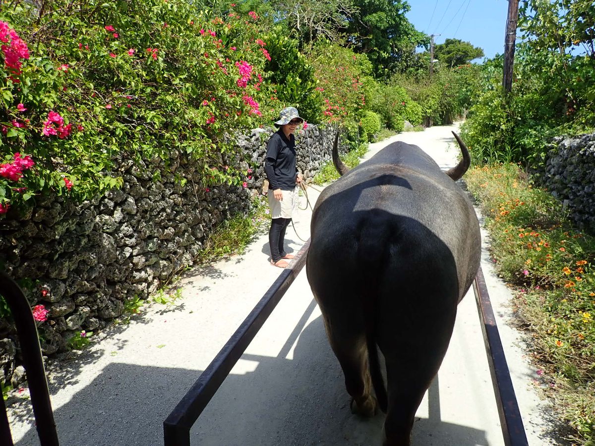 竹富島に訪れたら1度は参加オススメします!赤瓦のいえ、白い砂が一面に広がる沖縄らしい街並みを水牛に乗って観光するのは最高です。