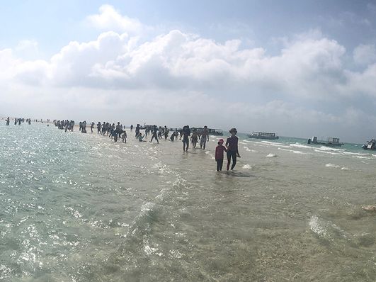 着いてからは、島?から少し離れたところに止まるので、50-60センチぐらいの深さのところを歩いて濡れながら上陸します。