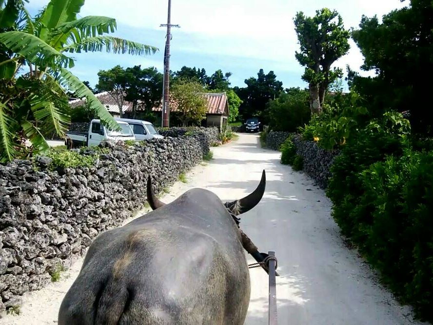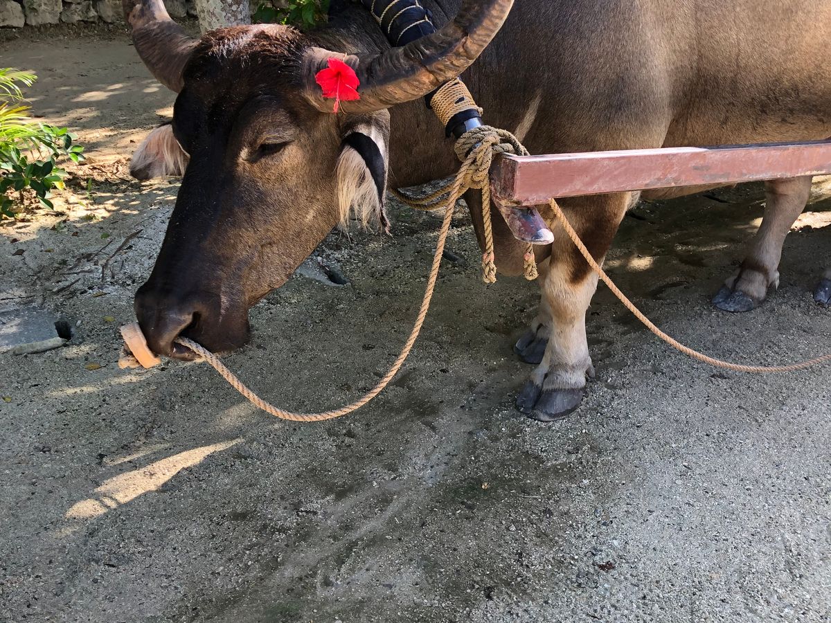 20人前後の人が乗った車を引くことができる超力もちの水牛さん。今回はアーパーくんという水牛の車に乗せてもらいました!体は大きくて迫力があるけれど、目がクリクリで大人しくてとても可愛かったです(^^)ガイドさんの三線の弾き語りも素晴らしかったです。また、竹富島についての説明もとても勉強になりました!