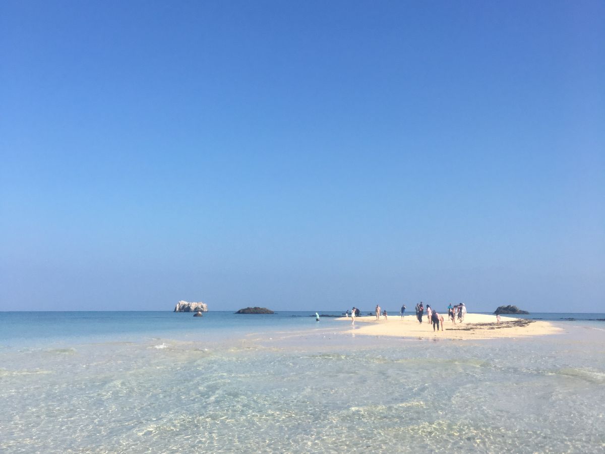 小型ボートで15分ぐらい乗ると綺麗なブルーの海と白い島が見えてきてテンションがかなり上がりました。