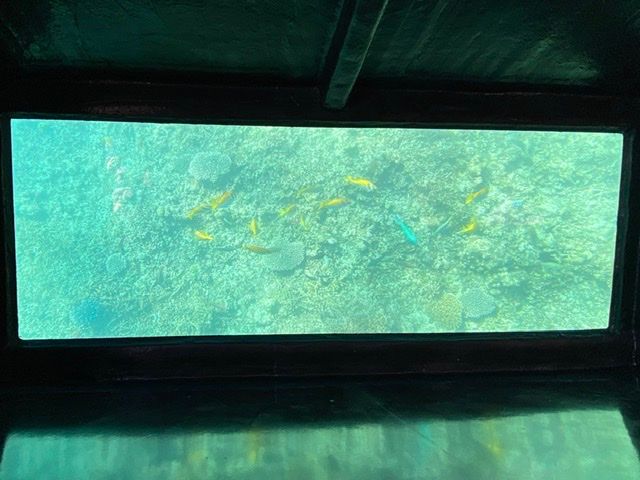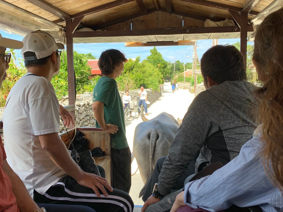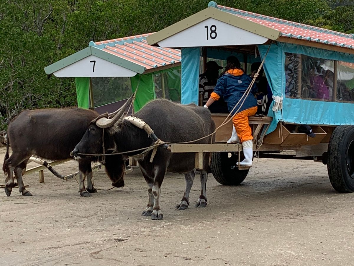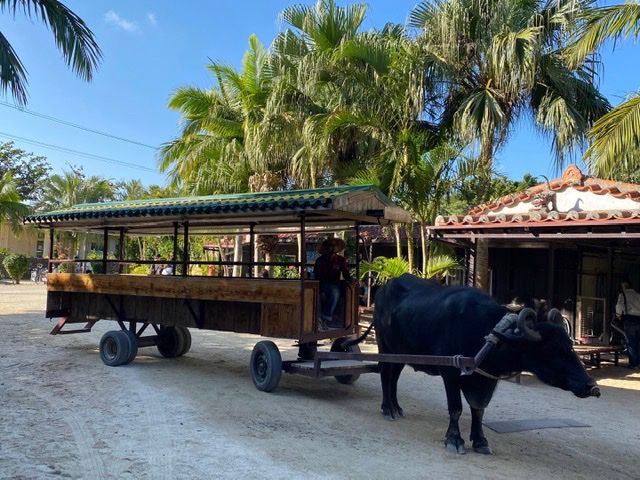 ひっきりなしに船がはいってくるので、2隻待ってからグラスポートは出発。餌付けされている場所を何か所か周り沢山の魚を見ることが出来ました。次はバス。こちらも混乗なので、別の船到着を船乗り場で待ってからの出発。星の砂が見つかる砂浜を散策し、集落の真ん中にある水牛車乗り場へ。建物の受付カウンターへ行き、どの水牛車に乗るかの指示を受けて乗りました。