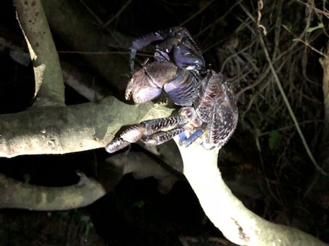 最後にヤシガニが見られるポイントへ向かいました。着く直前にヤシガニが道端に現れ、運良くヤシガニも見られました。ガイドさんが杖を使って捕まえてくれ、写真もバッチリ撮れました!