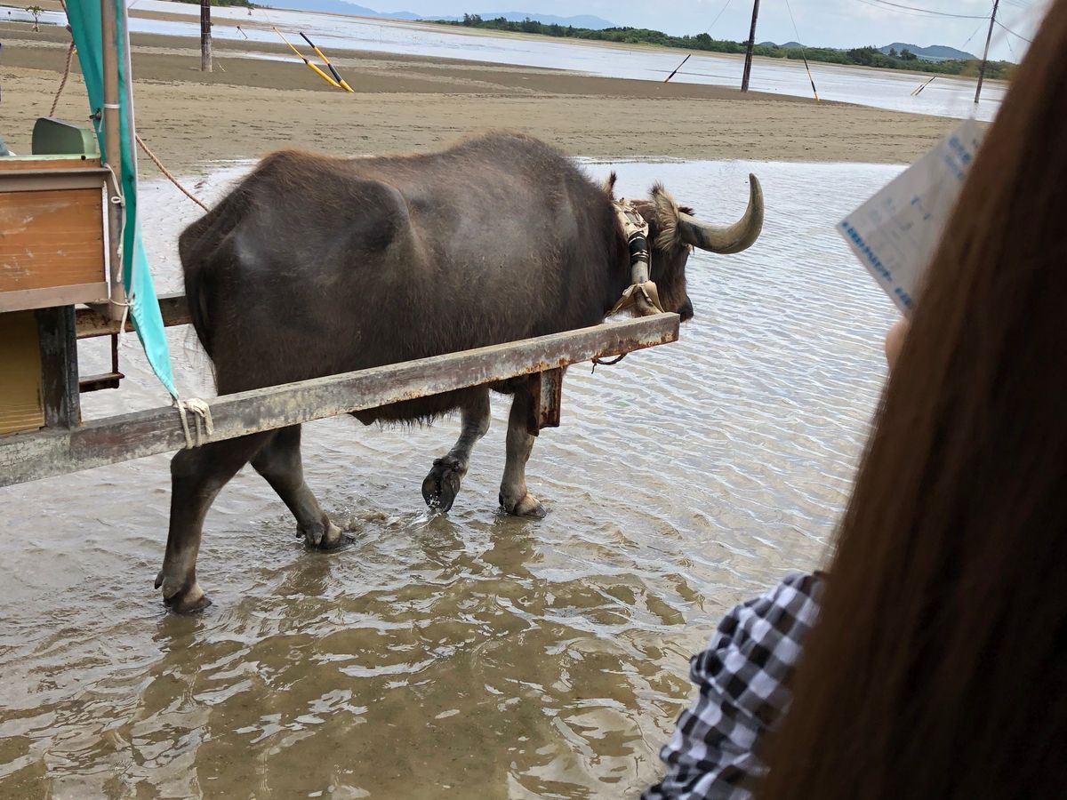 西表島から由布島へ渡る水牛車は海峡を渡り