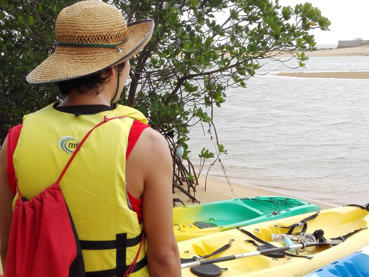 時間になり、出発前に岸でオールの使い方や、マングローブの枝の避け方などの説明を聞き、実際にオールを動かしてみて練習し、いざ出発です!
