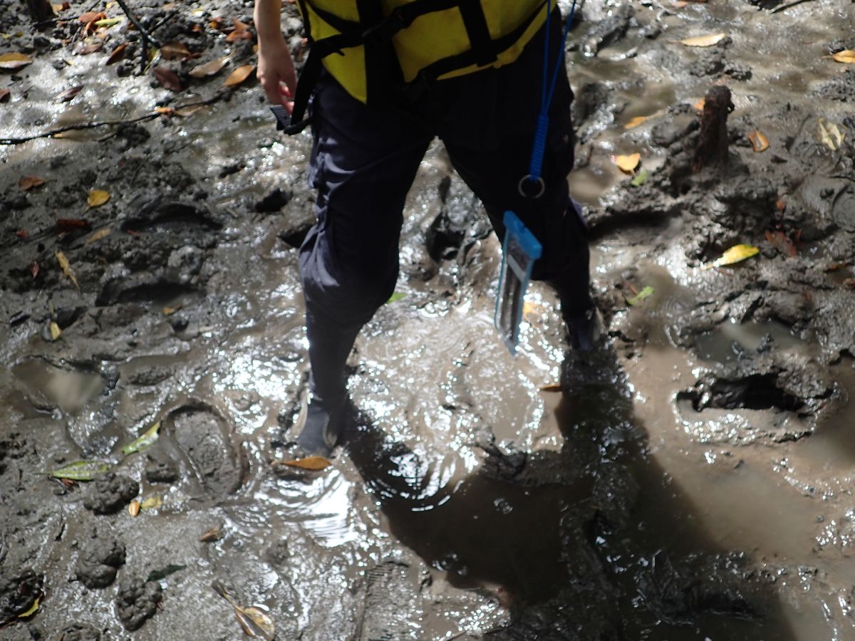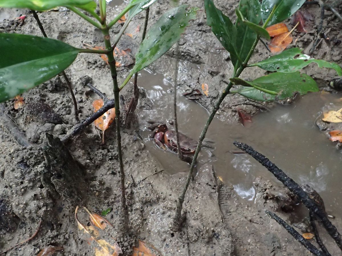 川の両岸に大きなマングローブの林があり、マングローブの種類によって生え方が違うことや、根のところにたくさん蟹がいることを教えてもらいました。