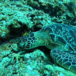 体験ダイビングとシュノーケルに参加しました。乗船したのは、自分たち家族5人と他参加の女性2人組とスタッフの方が二人。2グループに分けて片方がダイビングしている間に他がシュノーケルというスケジュールだったのですが。自分たちが家族ということもあって.グループ分けが2人と4人(子供はシュノーケルのみ)。1番最初は自分から。海に入ってから呼吸、耳抜きなどをゆっくり丁寧に教えてもらいつつ海底へ。海底の岩に捕まって待つように指示されました。…これを残り3人へやるわけです。その間、海底の岩を掴んだまま一人で10分は待っていたと思います。不安だし、同じ体制で腰が痛くなってくるし…ダイビングも以前やった時は海中を泳いだのですが、ほぼ岩を掴んで進みほとんどアシヒレを使いません。海底をハイハイしている感じです。もう一つのグループは二人に一人のスタッフさんですが、こっちは、4人に一人。倍なわけです。さすがにスタッフさん、少ないのでは?と思いました。こちらの人数が多いから、安全のためハイハイなのかなとか。ウミガメも見られてよかった面もありますが、ダイビングを体験される方はスタッフさん1人につき何人付くのか事前に聞いた方がいいと思います。