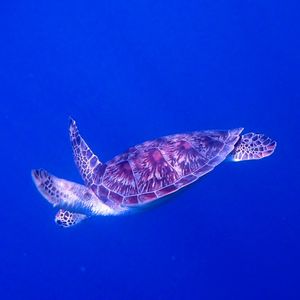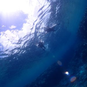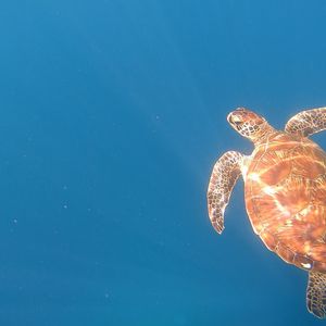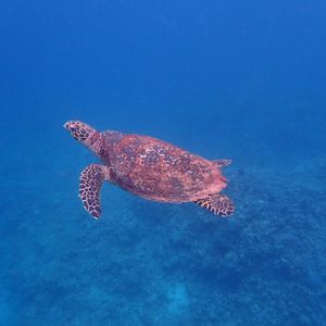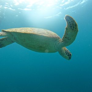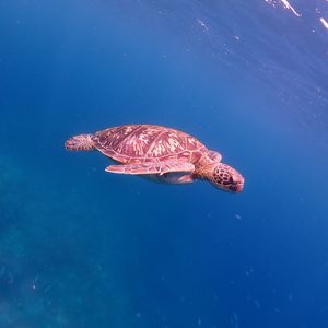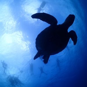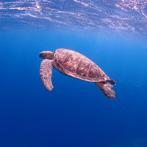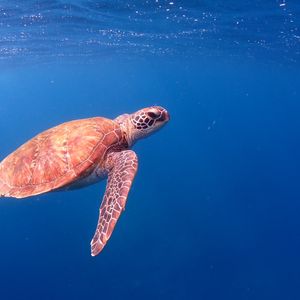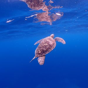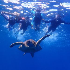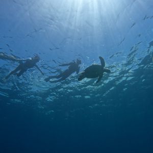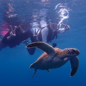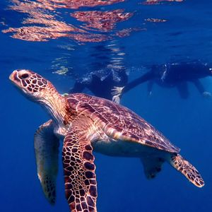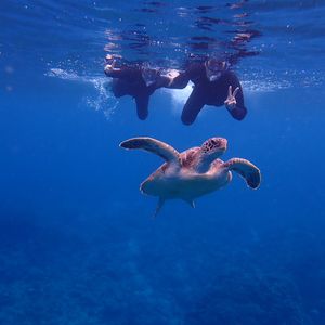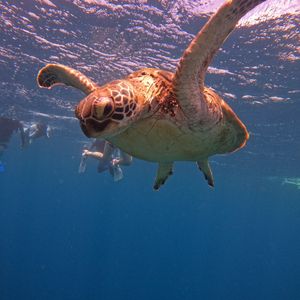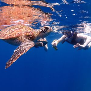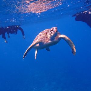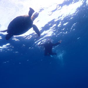 ウミガメを見つけると、呼吸のために水面に浮上するのを待って一緒に泳ぐことができます。