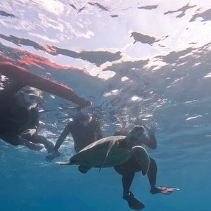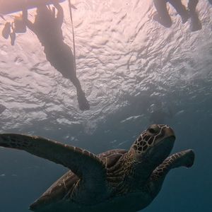 午前中に到着する飛行機での午後参加でした。昼食後すぐに船だと船酔いが心配だったのでビーチエントリーで安心でした。シュノーケリングの器具の説明も丁寧でした。明るく親しみやすいお兄さん達で子供も安心していました。体力がなくなった私も浮輪で引っ張ってくれて時間があっという間でした。肝心の亀さんは海底で寝ている姿でしたが、なかなかシュノーケリングでは行けない深さまで案内していただき海蛇なども触らせてくれて他では出来ない経験が出来ました!また是非参加したいと思います。