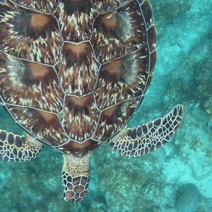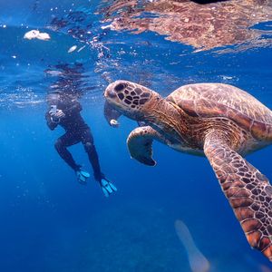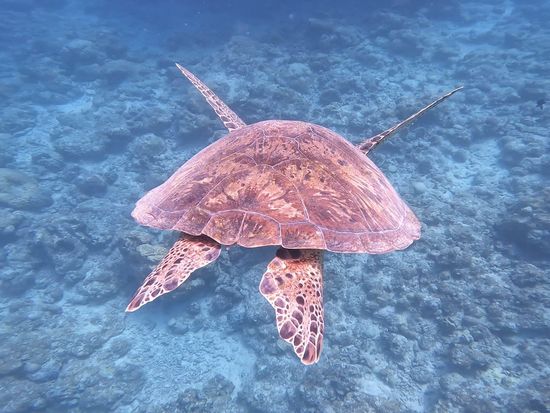 ガイドさんはウミガメ個体の性格も熟知しているようで、下の方にじっとしているウミガメを見つけて、人慣れしたウミガメなので待った方が良いとのことでしばらく待ち、上がってきたウミガメと併走して泳ぐ幸運に恵まれました。