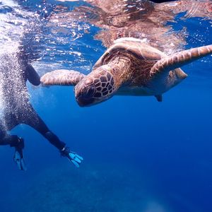 海に入ると思ってたより冷たく、60歳過ぎて人生初のシュノーケリングに不安なところもありましたが、説明があった後、浮き輪に捕まって行きましょうとおっしゃっていただき、青の洞窟も見れ、ウミガメと泳ぐこともできました。