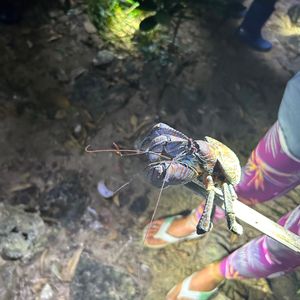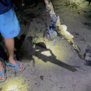 移動に貸し出し用の長靴装着!雨じゃない日は長靴になるのか分かりませんが、靴下は持って行ったほうが良いです!ジャングルの入口まで到着し、1人1人に懐中電灯がわたされ、暗闇のジャングルを懐中電灯の光だけで進んでいきます!今回、もう1組の子連れのご家族と一緒でみんなで一列になり、何かを発見するとお互い声をかけ合い、みんなで協力してお目当ての『ヤシガニ』を探しました!歩いている途中も、珍しい植物のお話や他の生物を見つけると、それについても詳しく教えてくださり、とても勉強になりました!!そして、ついにヤシガニ発見!!小ぶりのヤシガニでしたが、みんな大喜び!その喜びも束の間、ガイドさんがめちゃくちゃ大きいヤシガニを発見してくださり、目の前で迫力満点のヤシガニを見ることができました!子どもはもちろん大人も大喜びで大興奮でした!途中小雨が降ってきたので、持参していたカッパが役に立ちました!