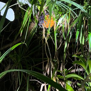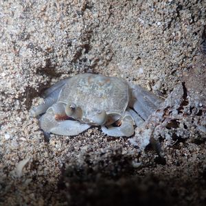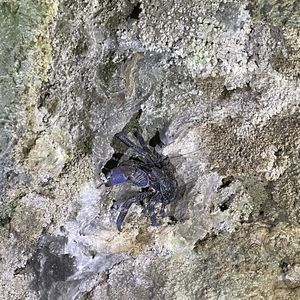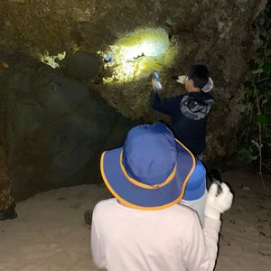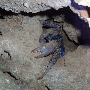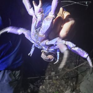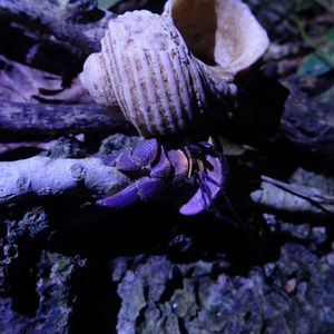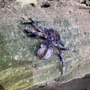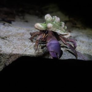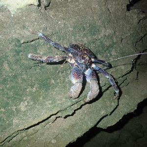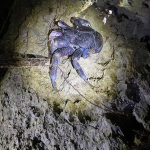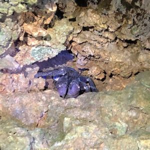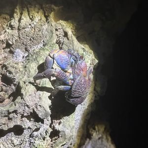 ガイドさんがいました!と教えてくださり、斜面を登っていくと、、、ライトで青紫に光るヤシガニが岩の間にいました。体全体は見えませんでしたが、ハサミが大きくてびっくり。迫力がありました。